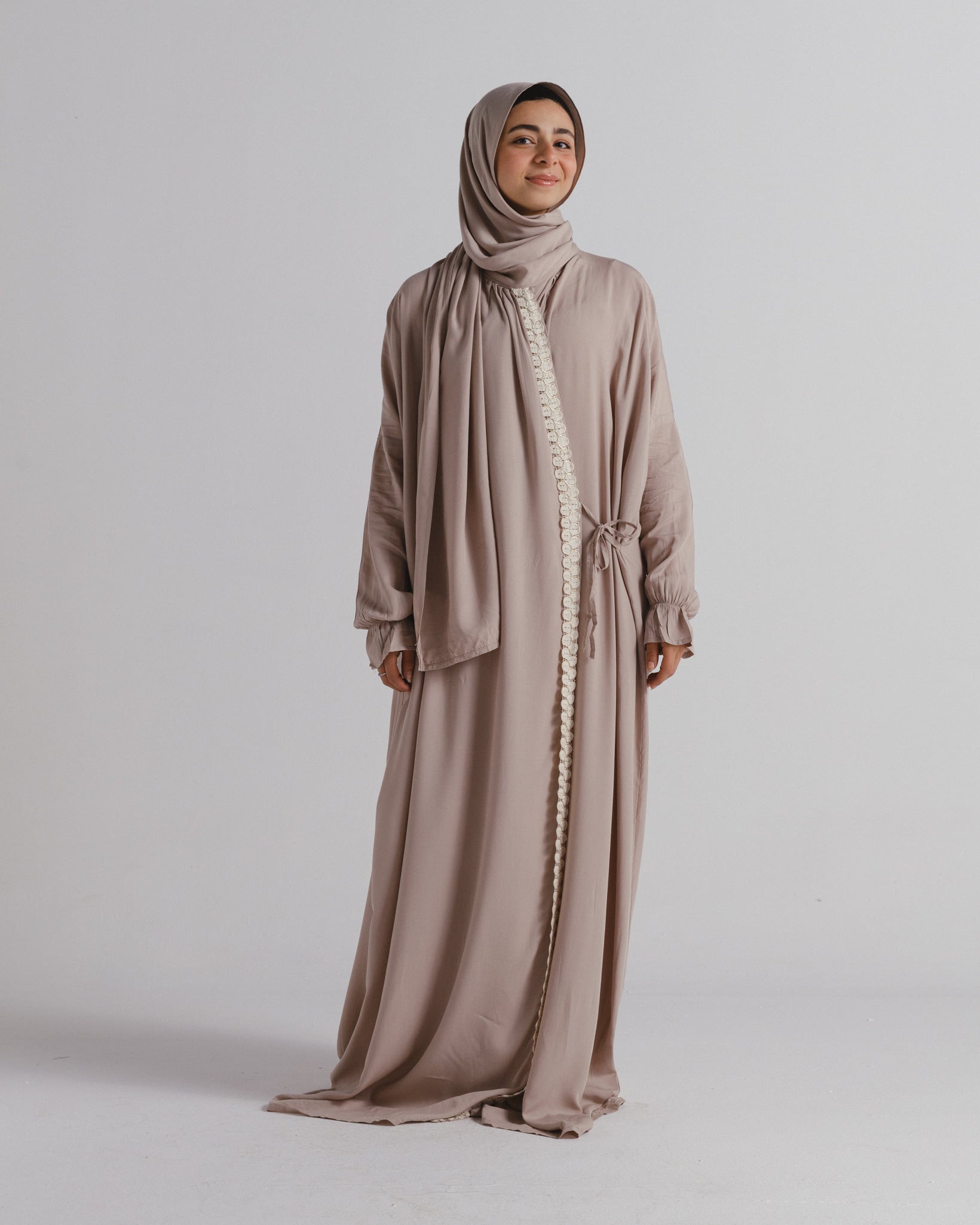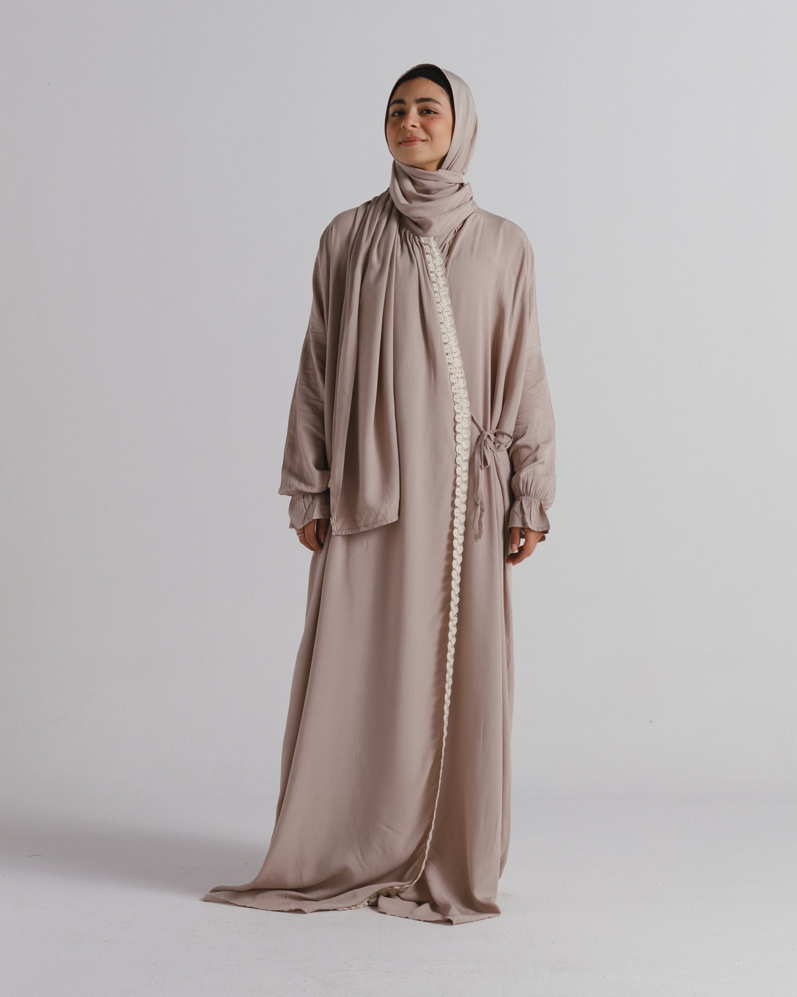 Sakinah Wrap Prayer Set – A timeless blend of comfort and elegance. Designed for ultimate flexibility, this prayer set allows you to wrap and adjust it according to your personal preference. Whether you prefer a snug fit or a flowing drape, it offers both coverage and ease, making it perfect for prayer at home or on the go. Crafted from soft, breathable fabric - Scarf is attached to the prayer set.