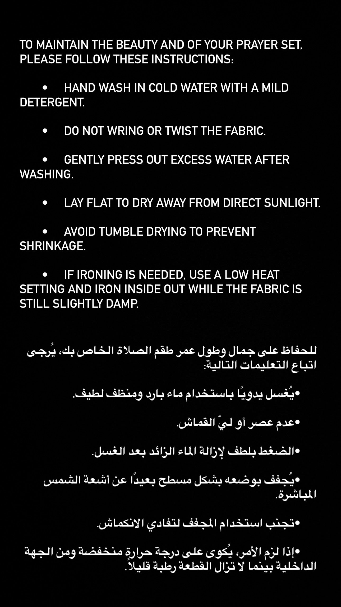 للحفاظ على جمال وطول عمر طقم الصلاة الخاص بك، يُرجى اتباع التعليمات التالية:
