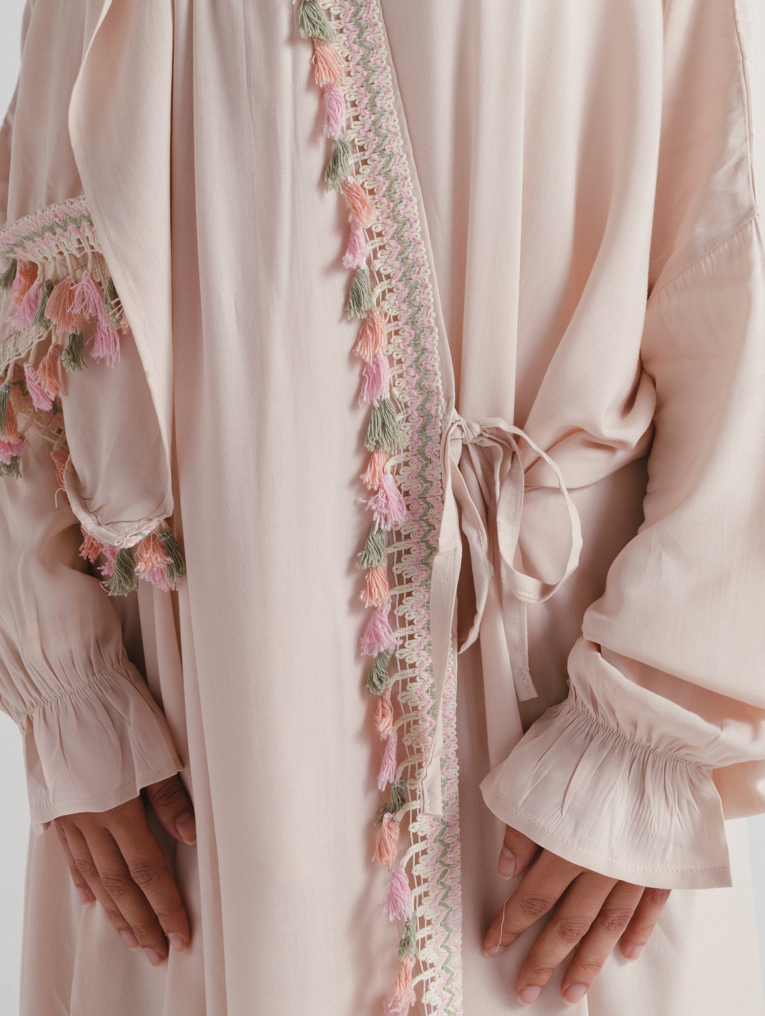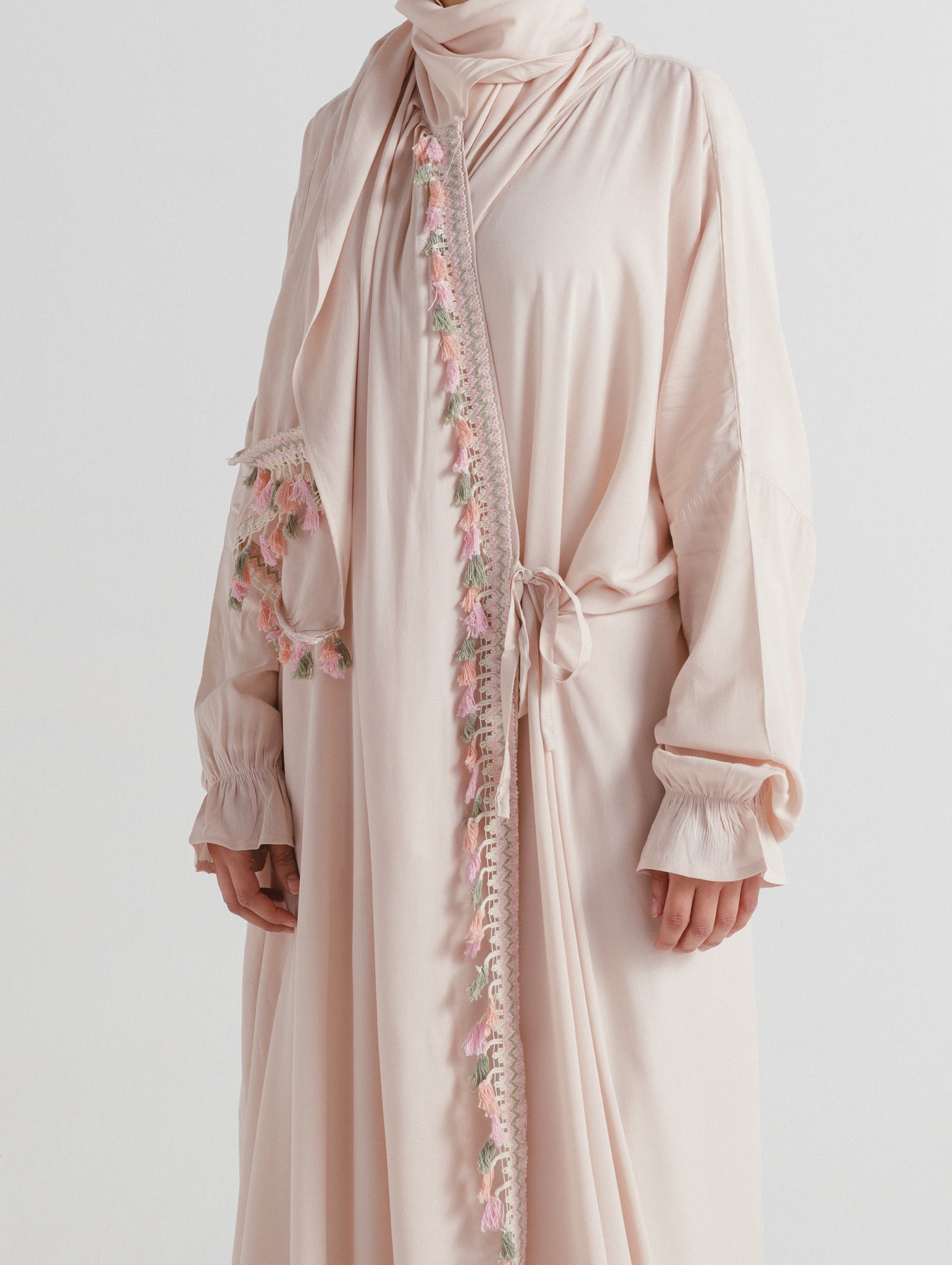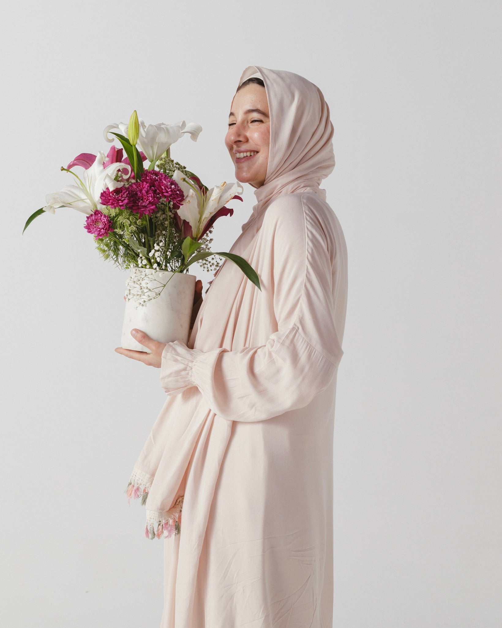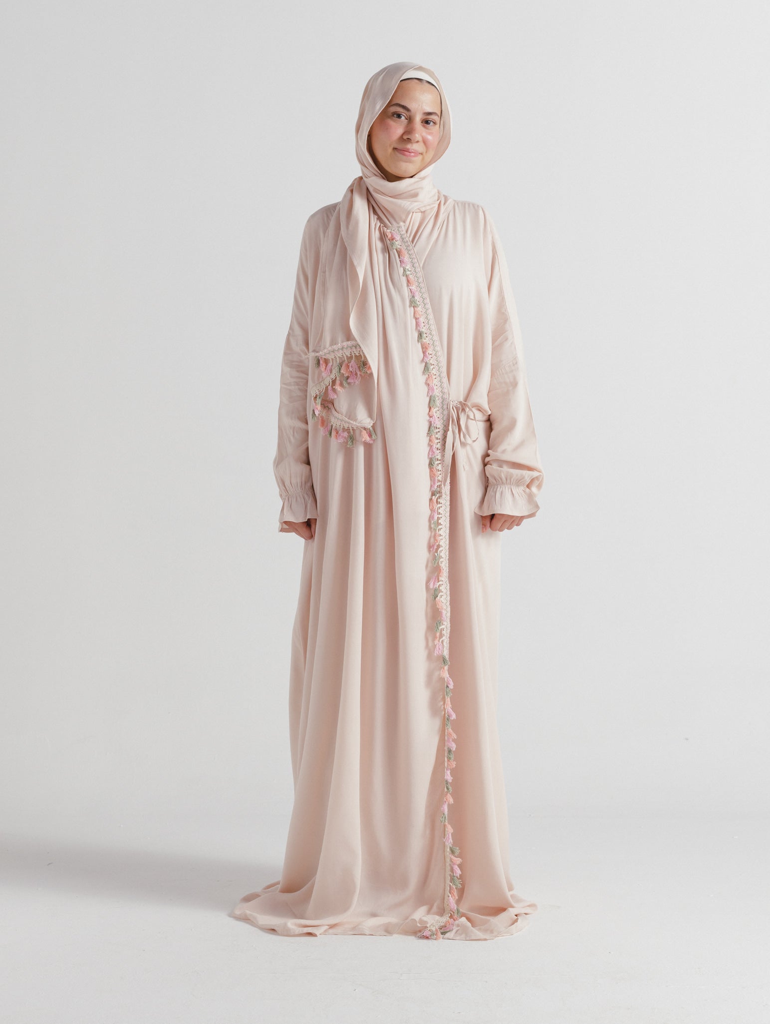 Sakinah Wrap Prayer Set – A timeless blend of comfort and elegance. Designed for ultimate flexibility, this prayer set allows you to wrap and adjust it according to your personal preference. Whether you prefer a snug fit or a flowing drape, it offers both coverage and ease, making it perfect for prayer at home or on the go. Crafted from soft, breathable fabric - Scarf is attached to the prayer set.