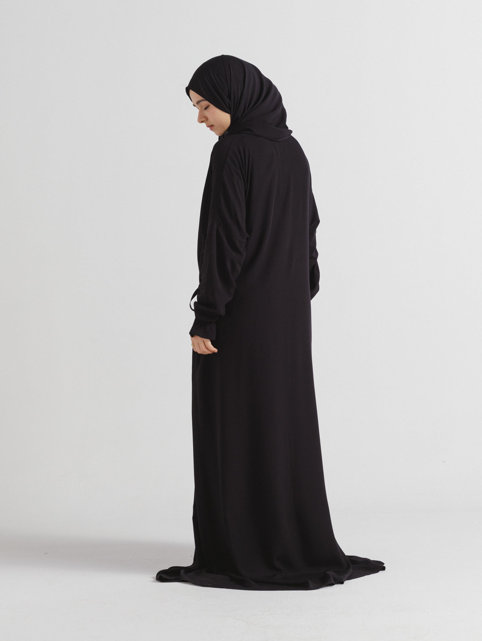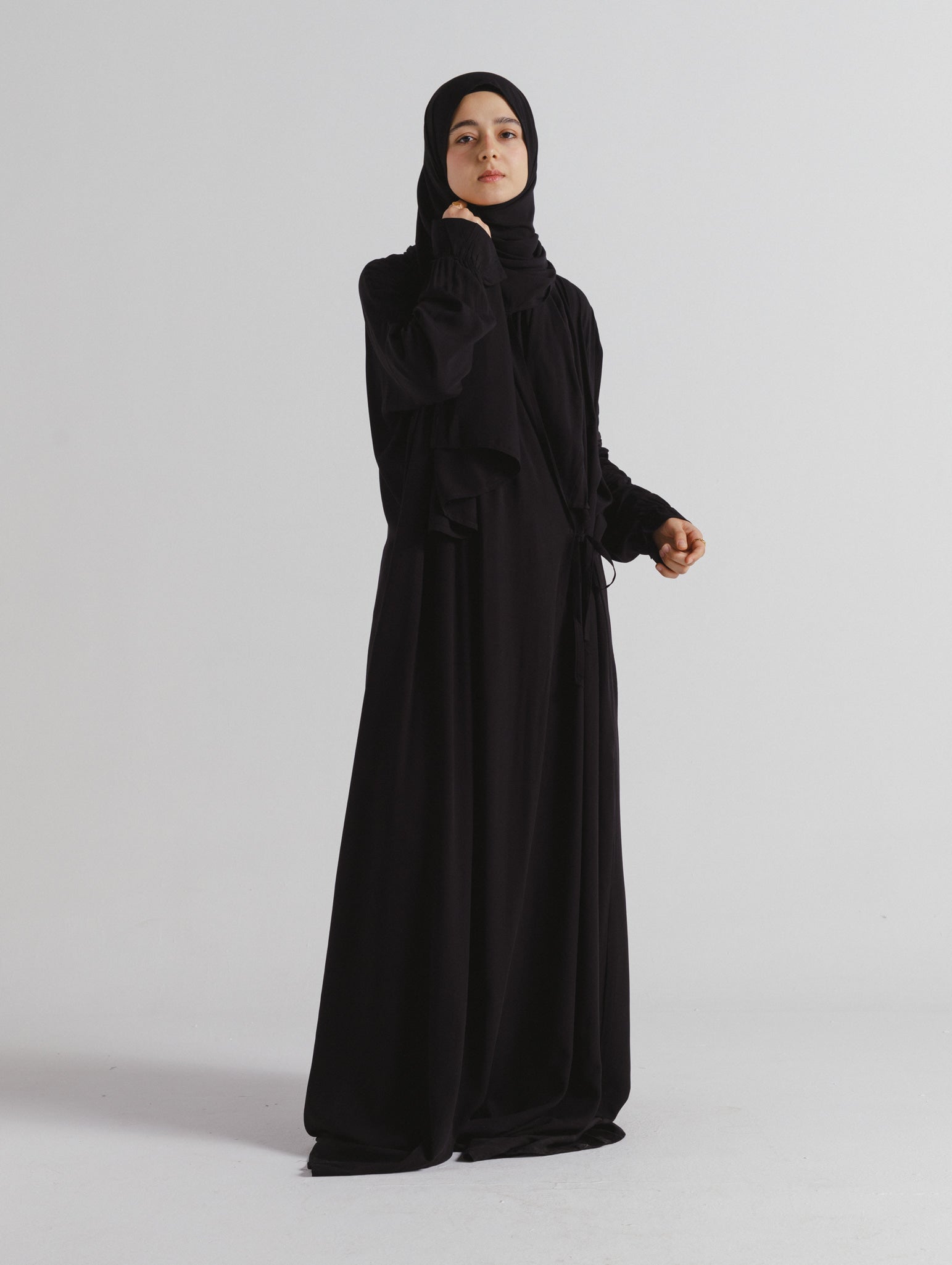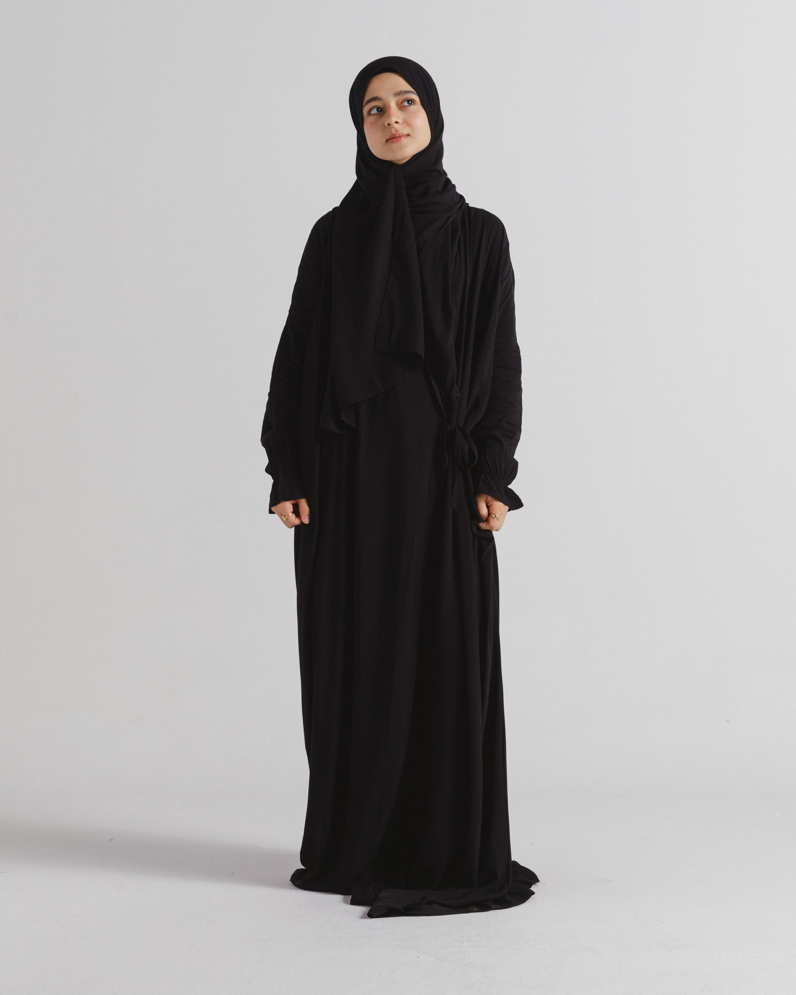 Sakinah Wrap Prayer Set – A timeless blend of comfort and elegance. Designed for ultimate flexibility, this prayer set allows you to wrap and adjust it according to your personal preference. Whether you prefer a snug fit or a flowing drape, it offers both coverage and ease, making it perfect for prayer at home or on the go. Crafted from soft, breathable fabric - Scarf is attached to the prayer set.